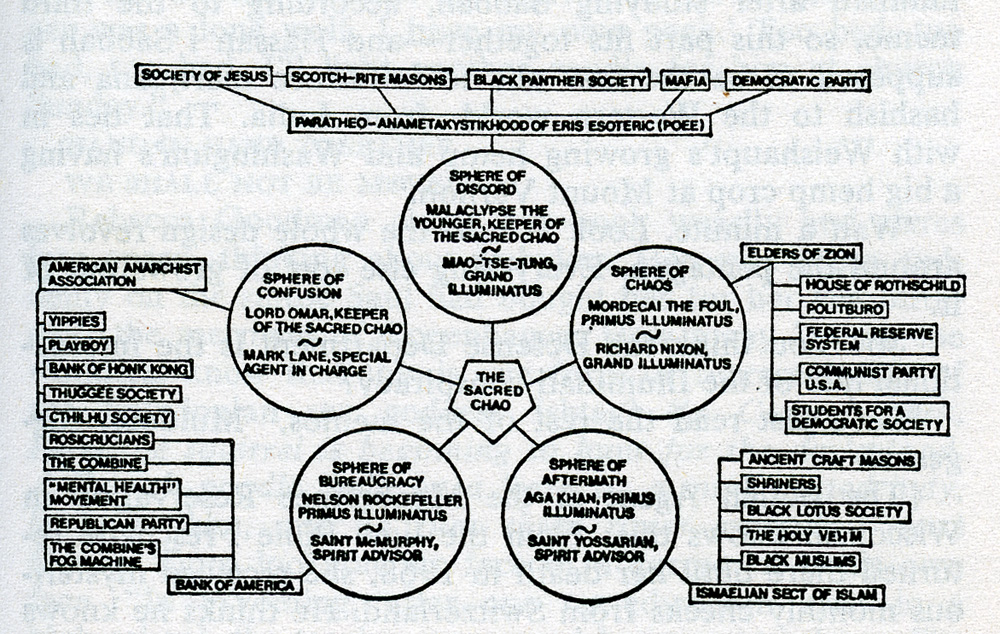 W trakcie całego zamieszania z zabójstwem Kennedy’ego Kerry wpadł na pomysł, który w jego mniemaniu miał utrudnić Garissonowi dochodzenie. Zaczął rozgłaszać wszem i wobec, że jest członkiem Bawarskich Iluminatów. Ponieważ była to najbardziej absurdalna teoria na jaką wpadł, postanowiłem zapoznać się bliżej z tymi Iluminatami. Im bardziej się zagłębiałem w ich historię, tym bardziej mnie fascynowali, a że szkoda mi było nie wykorzystać zdobytej w trakcie tych badań wiedzy, postanowiłem połączyć iluminizm z dyskordianizmem. Skoro celem dyskordian jest promowanie chaosu, dlaczego Iluminaci nie mieliby dążyć do totalitaryzmu? W końcu, by Discordian Society było naprawdę dyskordiańskie powinno mieć wewnętrzną frakcje dysydencką, czyż nie?