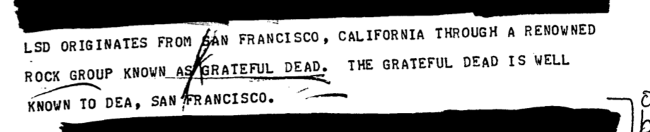 LSD ma swoje źródło w San Francisco, w Kalifornii – rozprowadza je znany zespół Grateful Dead. The Grateful Dead jest dobrze znany DEA z San Francisco.