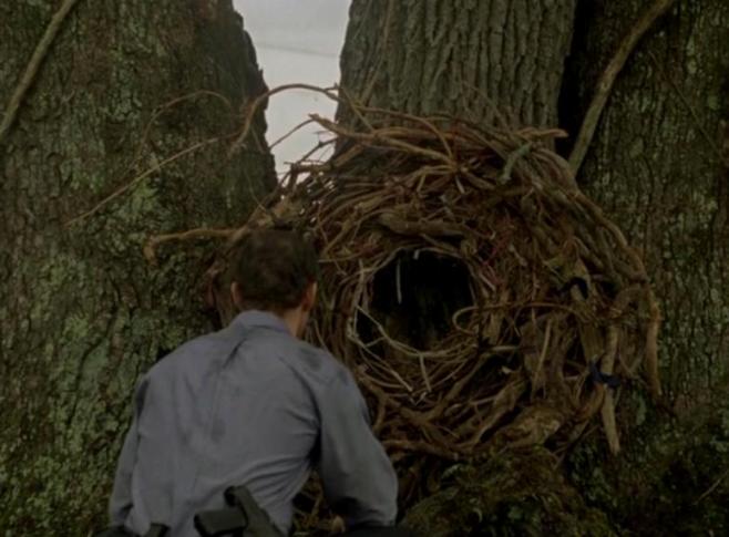 W pierwszej z nich widzimy Cohle’a siedzącego na szpitalnym łóżku z długimi, luźno zwisającymi włosami, w białej szacie (co przywodzi oczywiście na myśl Dobrego Pasterza), wpatrującego się w pustą przestrzeń. Kamera dokonuje bardzo powolnego zbliżenia, a samo ujęcie opatrzone jest bardzo specyficznym, ambientowym podkładem i zdecydowanie przypomina Odyseję kosmiczną 2001. Druga z nich to zaś seria krótkich ujęć pół-dzikiego krajobrazu Luizjany wprowadzających mistyczną perspektywę wieczności – wypisz, wymaluj, Koyaanisqatsi.