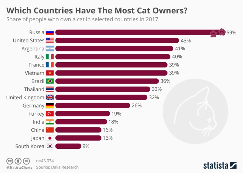 W tym samym czasie rośnie w siłę kocia populacja w domach na całym świecie z Rosją na czele, gdzie aż 59% mieszkańców posiada przynajmniej jednego kota. Na drugim miejscu plasują się obecnie Stany Zjednoczone, gdzie kota posiada 43% mieszkańców, a na trzecim Argentyna, gdzie popularność futrzaków z ogonem siega 41%.