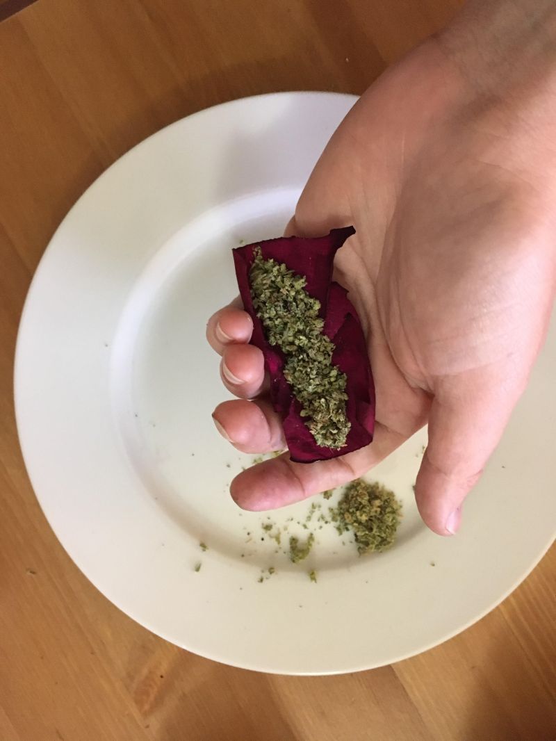 6. Po wyjęciu odczekaj 2-3 minuty, a następnie dodaj zmielone zioło i rozprowadź je po równo w ten sam sposób, w jaki zrobiłbyś to na bletce.