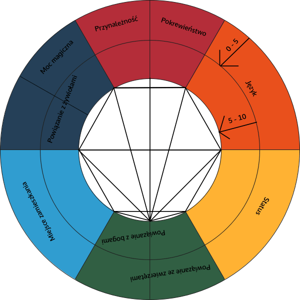 Wartość najwyższą umieszczamy po stronie wewnętrznej koła, a najniższą po stronie zewnętrznej, co sugeruje implicite, iż fluktuacja natężenia danego pola semantycznego ma bezpośredni efekt na pola sąsiadujące. Przykładowo, status aktora o wartości 0 może oznaczać, iż jest on niewolnikiem, czyli jednostką pozbawioną wolności i praw obywatelskich – w tym miejscu wyobraźmy sobie 15-letniego Sambijczyka o imieniu Warpune schwytanego przez Wikingów z Truso na początku X wieku – co oznacza, iż jest on klasyfikowany jako rzecz objęta prawem własności Poprzez niewolę traci on automatycznie łączność ze “wspólnotą ludzi”, więc jego pokrewieństwo w nowym układzie tożsamości również wynosi 0.