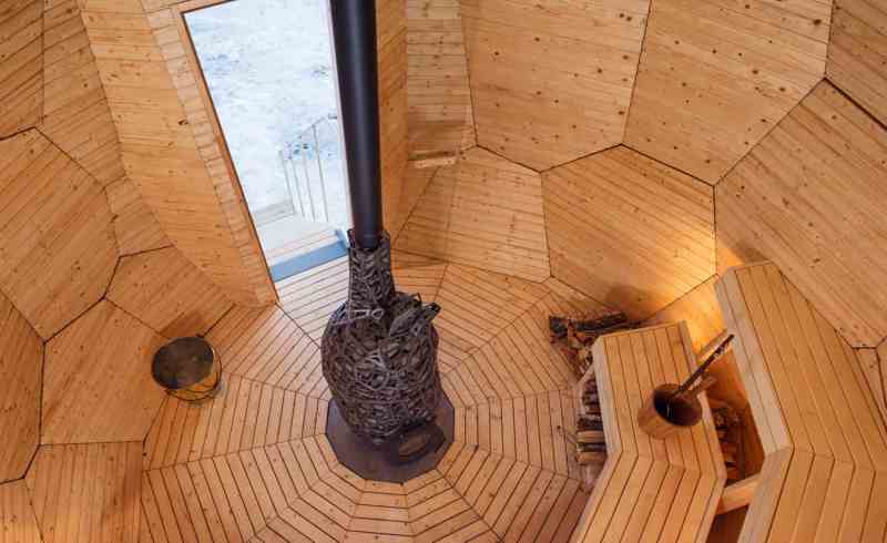 Sauna to również miejsce, które w skandynawskiej tradycji symbolizuje relaks, intymność i otwartość. Na wyrzeźbionych z topoli ławkach zasiąść może maksymalnie 7 osób, a do środka wejść można tylko za sprawą spuszczanej z góry drabiny.